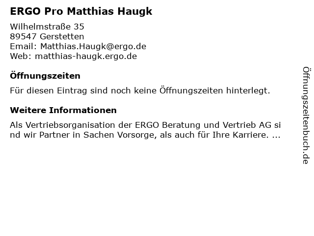 | Öffnungszeiten ERGO Pro Matthias Haugk in Gerstetten anzeigen | |