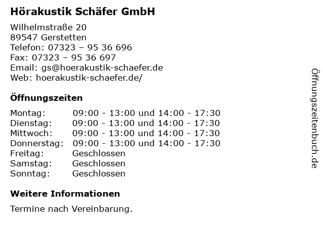 Öffnungszeiten Hörakustik Schäfer GmbH in Gerstetten anzeigen | |