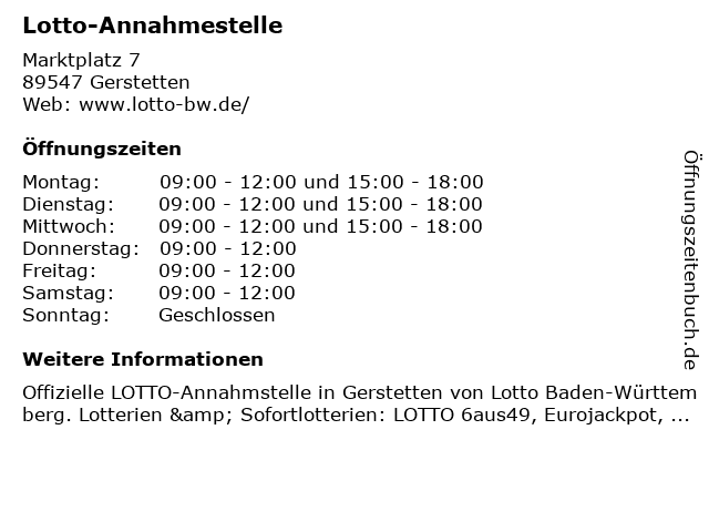 | Öffnungszeiten Lotto-Annahmestelle in Gerstetten anzeigen | |