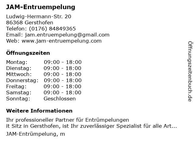 | Öffnungszeiten JAM-Entruempelung in Gersthofen anzeigen | |