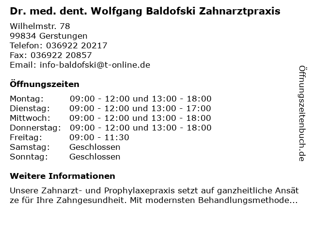 Branchen & Suchbegriffe zu Dr. med. dent. Wolfgang Baldofski Zahnarztpraxis:baldofski, dent., dr., med., wolfgang, zahnarztpraxis |