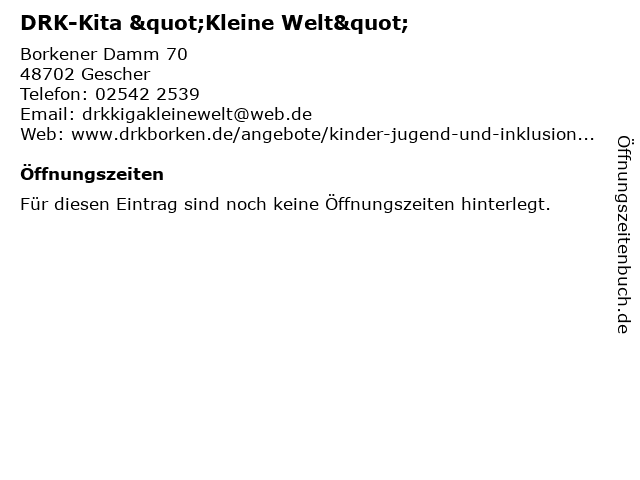 | Öffnungszeiten DRK-Kita "Kleine Welt" in Gescher anzeigen | |