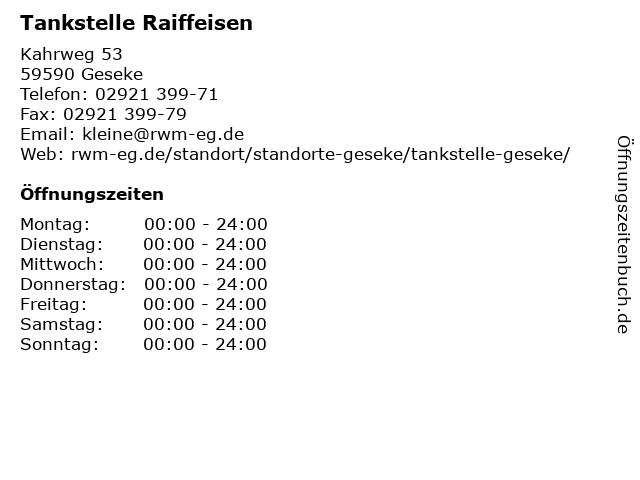 | Öffnungszeiten Tankstelle Raiffeisen in Geseke anzeigen | |