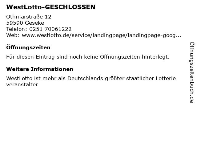| Telefonnummer WestLotto-GESCHLOSSEN in Geseke (0251 70061222) anrufen | |