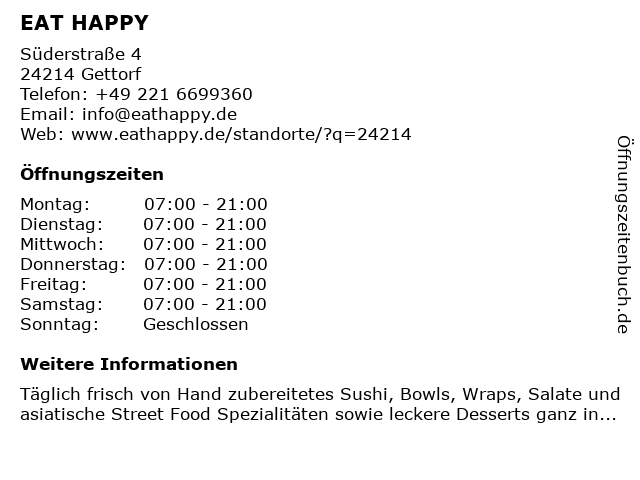 | Öffnungszeiten EAT HAPPY in Gettorf anzeigen | |