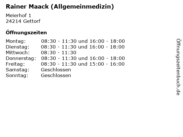 | Öffnungszeiten Rainer Maack (Allgemeinmedizin) in Gettorf anzeigen | |