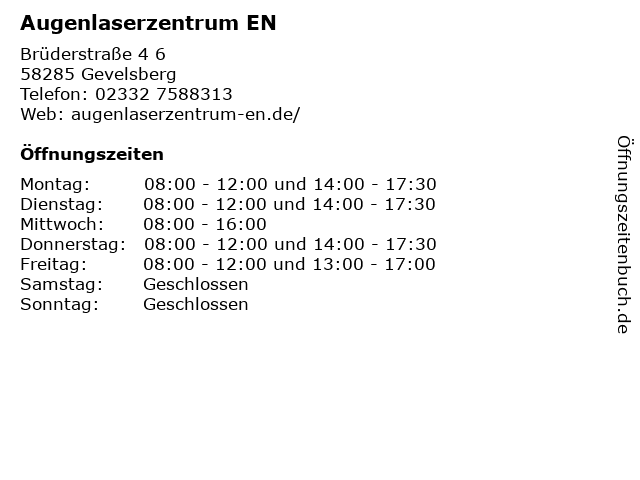 | Öffnungszeiten Augenlaserzentrum EN in Gevelsberg anzeigen | |