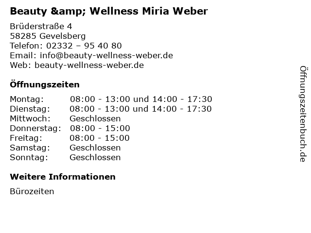 3 Fußbehandlung, diabetische u. podologische Praxis M. Weber Fußpflege (Entfernung: 1,26 km) Hagener Str. 152, 58285 Gevelsberg 4 Beauty & Wellness - Kosmetik-Studio Miria Weber (Entfernung: 1,26 km) Hagener Straße 152, 58285 Gevelsberg 6 |