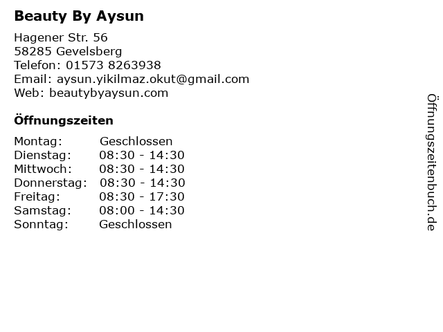 | Öffnungszeiten Beauty By Aysun in Gevelsberg anzeigen | |