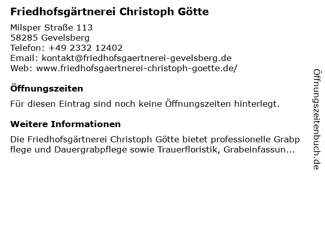 | Friedhofsgärtnerei Christoph Götte anrufen | |