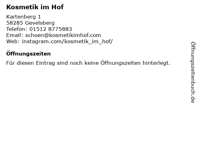 | Öffnungszeiten Kosmetik im Hof in Gevelsberg anzeigen | |