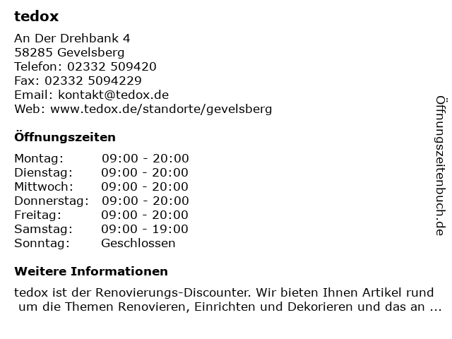 | Öffnungszeiten tedox in Gevelsberg anzeigen | |