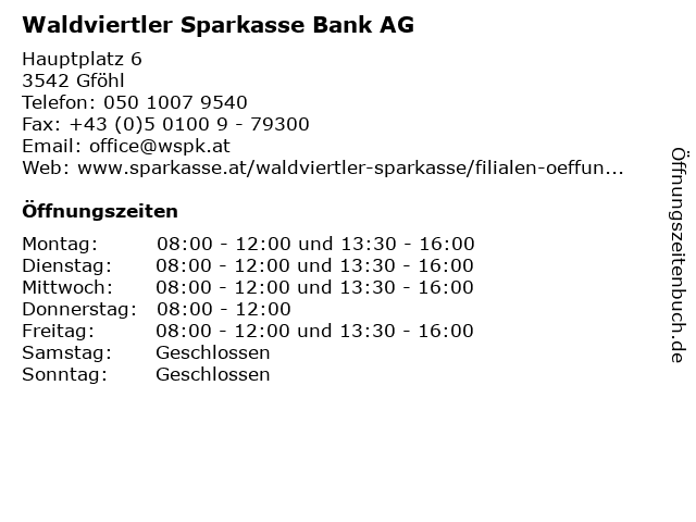 | Öffnungszeiten Waldviertler Sparkasse Bank AG in Gföhl anzeigen | |