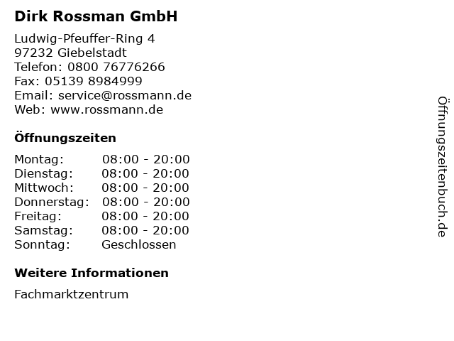 | Öffnungszeiten Rossmann Drogerie-Markt in Giebelstadt anzeigen | |