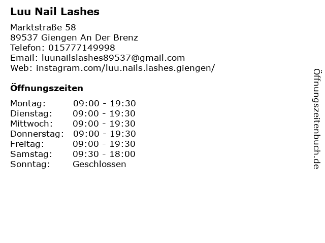 | Öffnungszeiten Luu Nail Lashes in Giengen An Der Brenz anzeigen | |