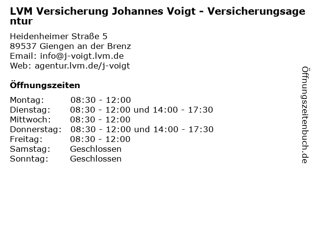 | Öffnungszeiten LVM Versicherung Johannes Voigt - Versicherungsagentur in Giengen an der Brenz anzeigen | |