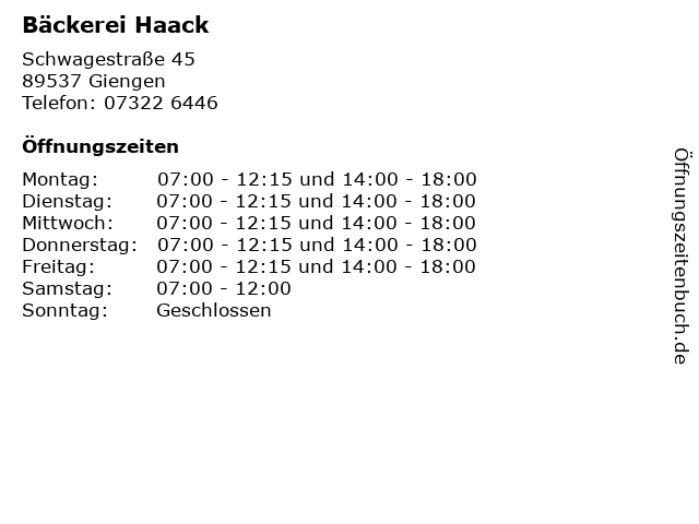 | Öffnungszeiten Bäckerei Haack in Giengen anzeigen | |