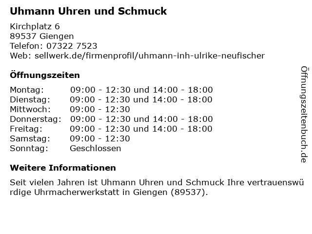 | Öffnungszeiten Uhmann Uhren und Schmuck in Giengen anzeigen | |