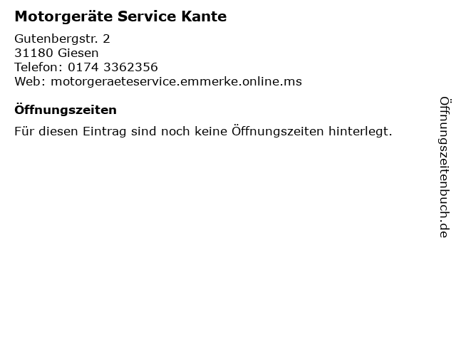 | Öffnungszeiten Motorgeräte Service Kante in Giesen anzeigen | |