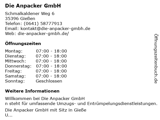 | Öffnungszeiten Die Anpacker GmbH in Gießen anzeigen | |