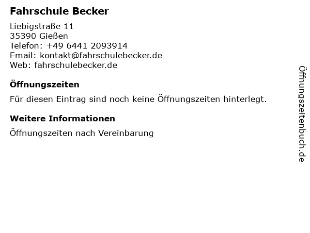 | Öffnungszeiten Fahrschule Becker in Gießen anzeigen | |