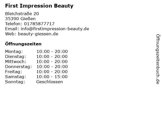 | Öffnungszeiten First Impression Beauty in Gießen anzeigen | |