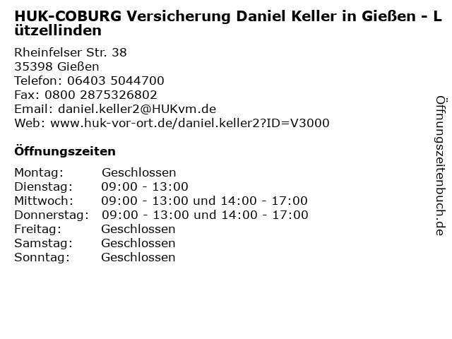 Öffnungszeiten HUK-COBURG Versicherung Daniel Keller in Gießen - Lützellinden
