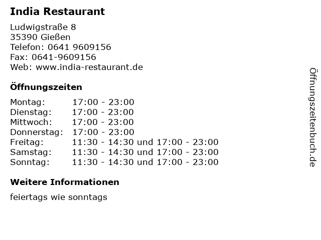 | Öffnungszeiten India Restaurant in Gießen anzeigen | |