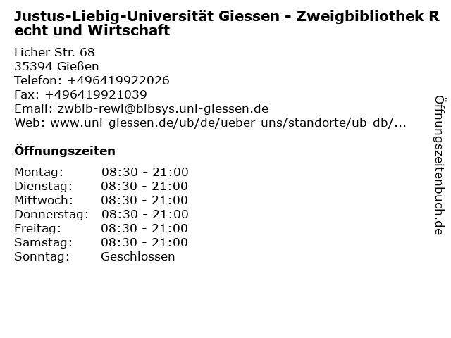 1 Justus-Liebig-Universität Giessen - Bibliothek - Öffentliches Recht / Prof. Bast (Entfernung: 0,09 km) Licher Str. 64, 35394 Giessen 3 Justus-Liebig-Universität Giessen - Bibliothek - Industrieökonomie, Wettbewerbspolitik und Regulierung (02-01) (Entfernung: 0,11 km) Licher Str. 62, 35394 Giessen 4 Justus-Liebig-Universität Giessen - Bibliothek (Entfernung: 0,47 km) Otto-Behaghel-Str. 10, 35394 Giessen 5 Justus-Liebig-Universität Giessen - Bibliothek (Entfernung: 0,47 km) Otto-Behaghel-Str. 10, 35394 Giessen 6 |