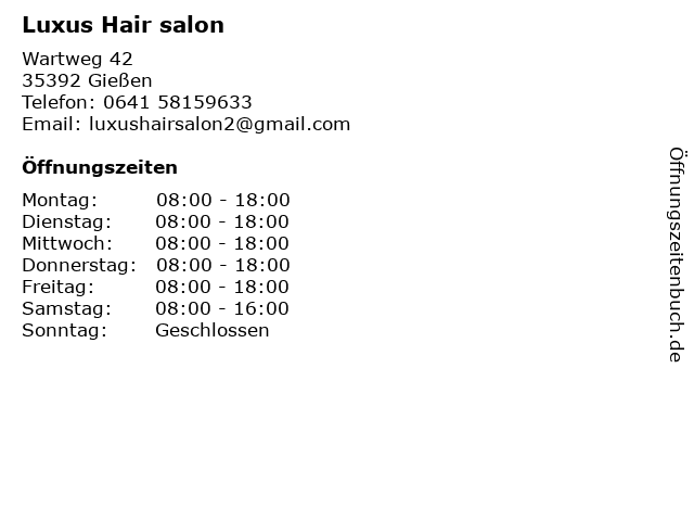 | Öffnungszeiten Luxus Hair salon in Gießen anzeigen | |