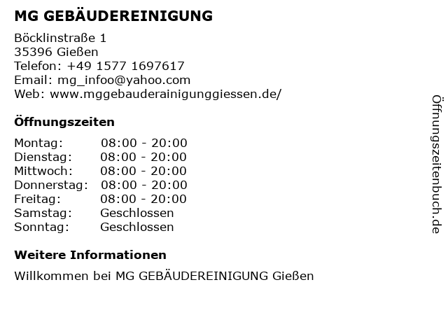 | Öffnungszeiten MG GEBÄUDEREINIGUNG in Gießen anzeigen | |