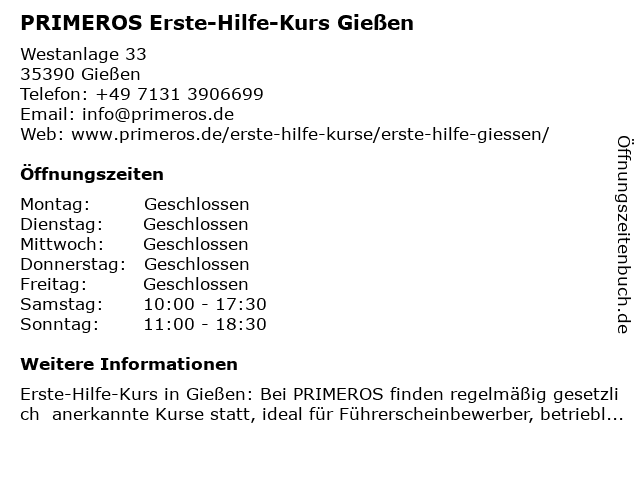 Branchen & Suchbegriffe zu PRIMEROS Erste-Hilfe-Kurs Gießen:erste, erste hilfe am unfallort, erste hilfe kurs, erste-hilfe, erste-hilfe-kurs, führerschein sehtest, herz-lungen-wiederbelebung, herzinfarkt, hilfe, kurs, primeros, schlaganfall, stabile seitenlage, verbandmaterial, weiterbildung |