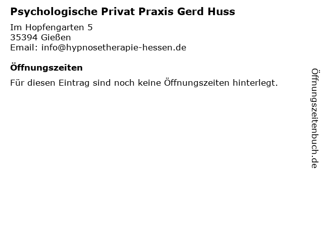 | Öffnungszeiten Psychologische Privat Praxis Gerd Huss in Gießen anzeigen | |