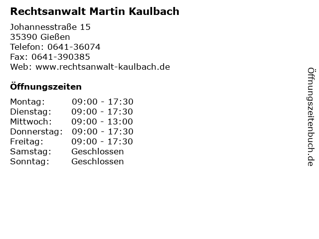 | Öffnungszeiten Rechtsanwalt Martin Kaulbach in Gießen anzeigen | |