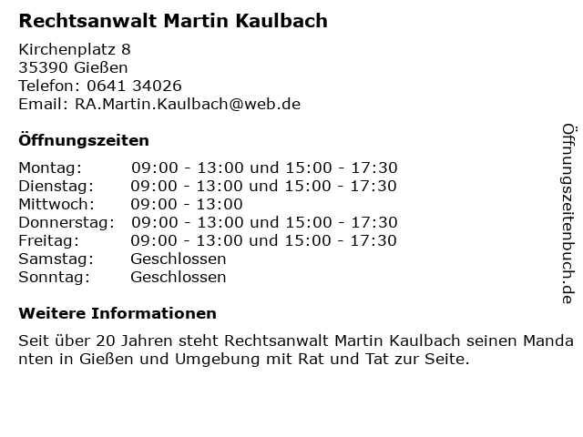 | Öffnungszeiten Rechtsanwalt Martin Kaulbach in Gießen anzeigen | |