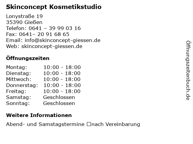 | Öffnungszeiten Skinconcept Kosmetikstudio in Gießen anzeigen | |