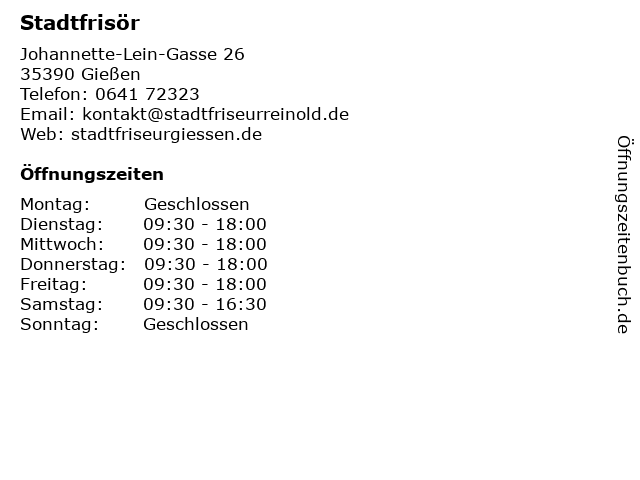 | Öffnungszeiten Stadtfrisör in Gießen anzeigen | |