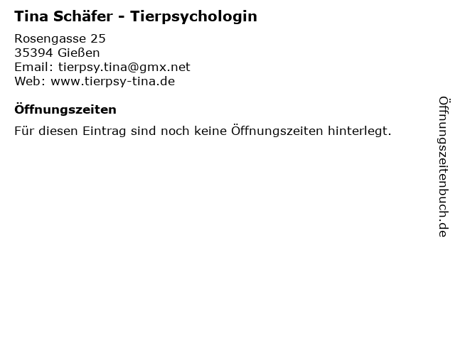 | Öffnungszeiten Tina Schäfer - Tierpsychologin in Gießen anzeigen | |