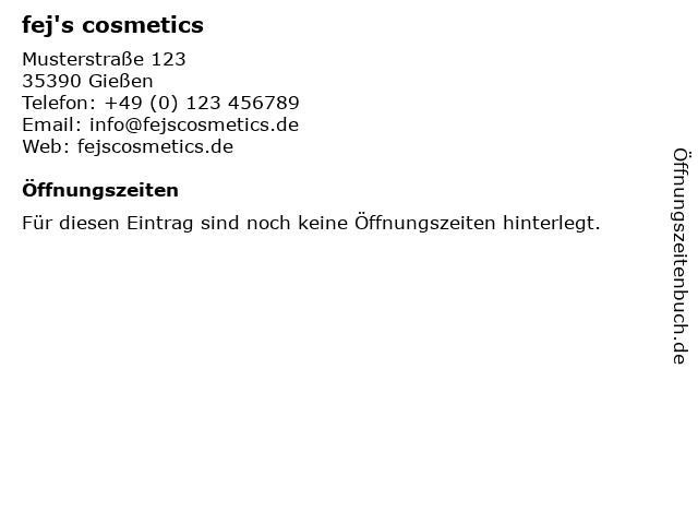 | Öffnungszeiten fej's cosmetics in Gießen anzeigen | |