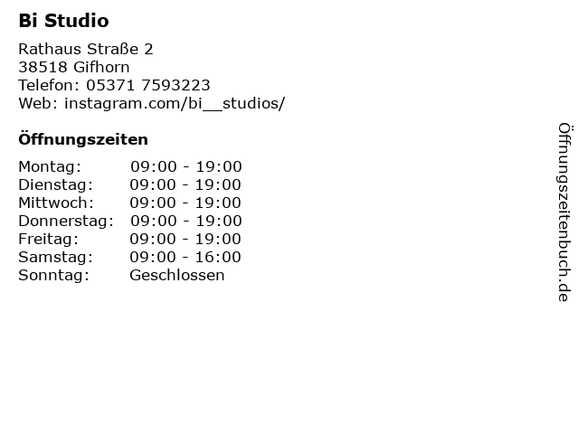 | Öffnungszeiten Bi Studio in Gifhorn anzeigen | |