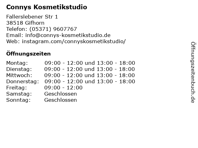 | Öffnungszeiten Connys Kosmetikstudio in Gifhorn anzeigen | |