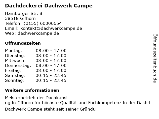 | Öffnungszeiten Dachdeckerei Dachwerk Campe in Gifhorn anzeigen | |