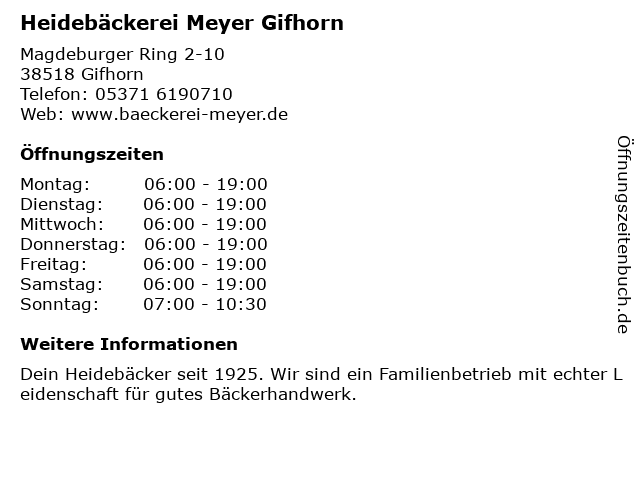 | Öffnungszeiten Heidebäckerei Meyer Gifhorn in Gifhorn anzeigen | |