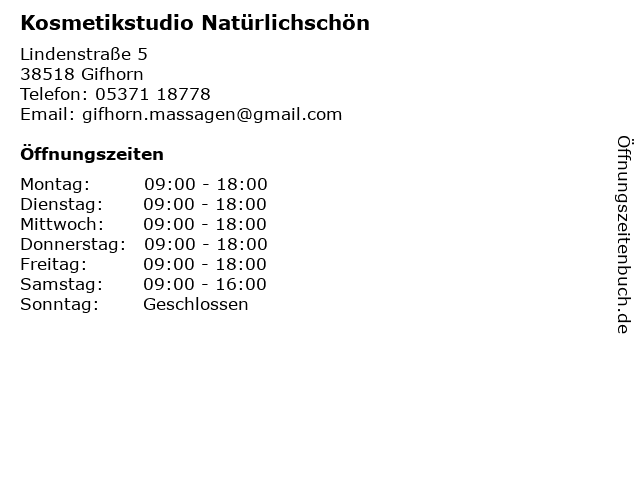 | Öffnungszeiten Kosmetikstudio Natürlichschön in Gifhorn anzeigen | |
