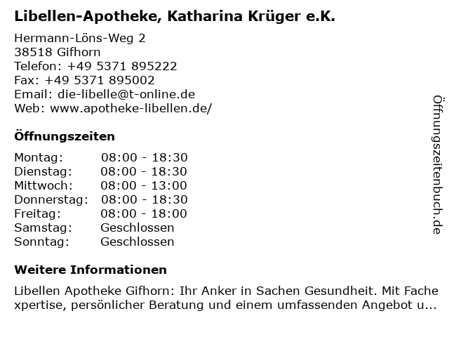 Branchen & Suchbegriffe zu Libellen-Apotheke, Katharina Krüger e.K.:apotheke, apotheke gifhorn, apotheken, apotheken lieferservice, babywaage verleih, bandagen, beratungen, blutdruckmessungen, blutzuckermessungen, botendienst, diabetikerberatung, e.k., ernährungsberatung, homöopathie, impfung, impfungen, katharina, kompressionsstrümpfe, kosmetik, krüger, libellen, milchpumpen verleih, mineralstoffberatung, phytothek |