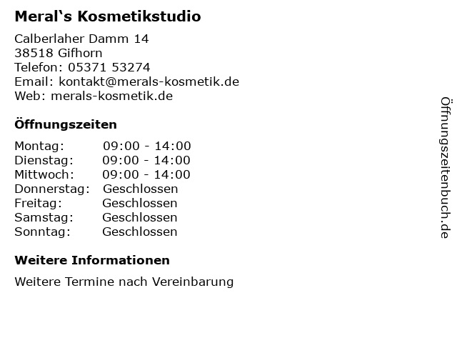| Öffnungszeiten Meral‘s Kosmetikstudio in Gifhorn anzeigen | |