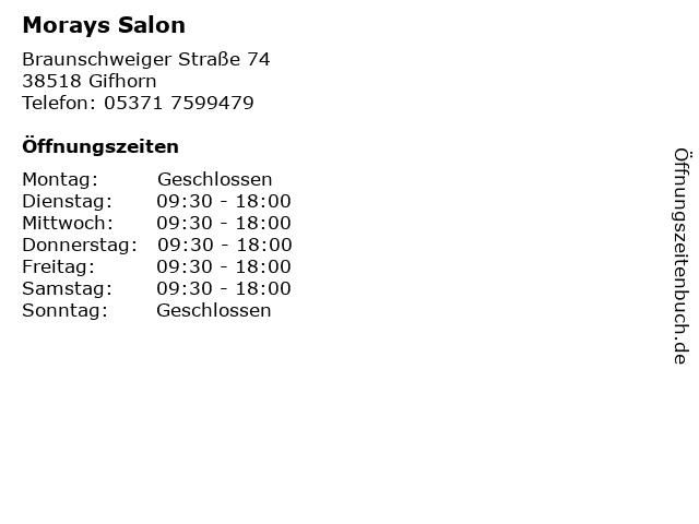 | Öffnungszeiten Morays Salon in Gifhorn anzeigen | |