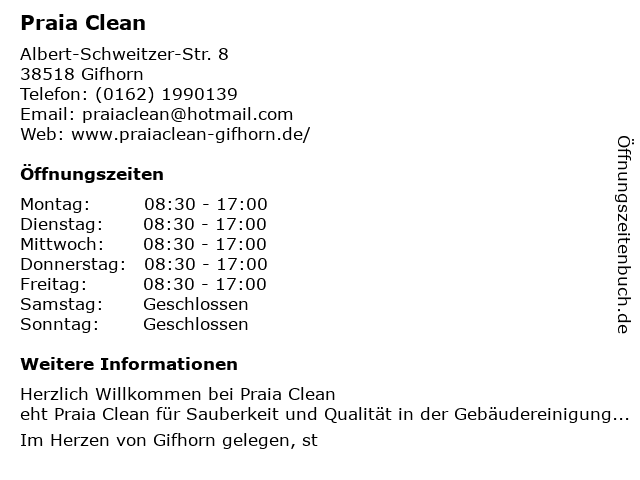| Öffnungszeiten Praia Clean in Gifhorn anzeigen | |