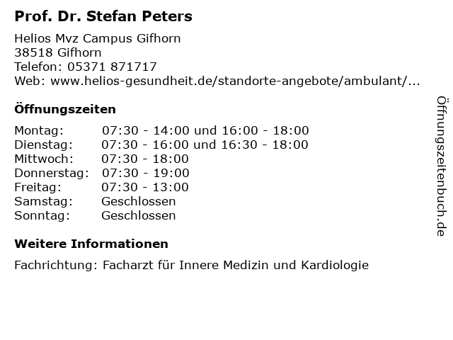 | Öffnungszeiten Prof. Dr. Stefan Peters in Gifhorn anzeigen | |