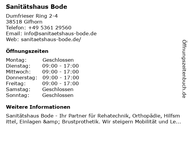 | Öffnungszeiten Sanitätshaus Bode in Gifhorn anzeigen | |